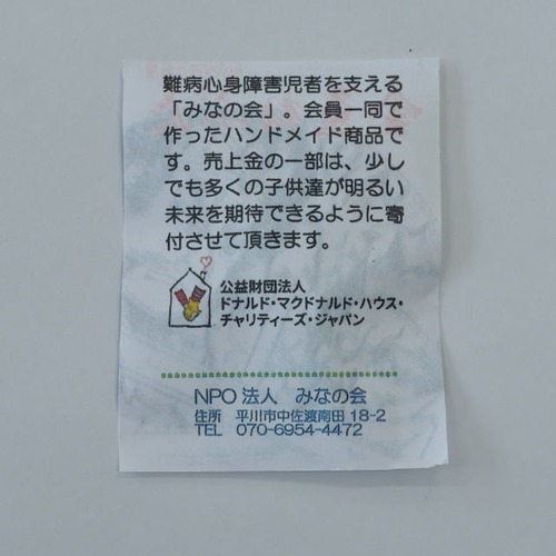 難病心身障害児を支える「みなの会」が、会員一同で作ったハンドメイド商品です。売上金の一部は、少しでも多くの子供達が明るい未来を期待できるように寄付させて頂きます。